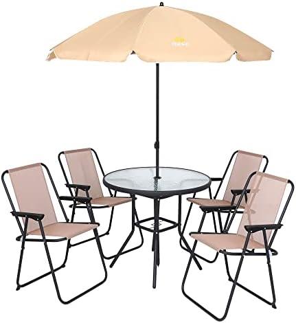 The elegant six-piece seating arrangement offers everything you need for an enjoyable outdoor experience. The set includes a round tempered glass table, a tilted removable umbrella, and four folding chairs, making it perfect for casual outdoor gatherings. Each chair is ergonomically designed with breathable mesh fabric, providing not only style but also comfort, accommodating up to 285 lbs of weight. The umbrella features UPF 50+ protection, ensuring you can enjoy your meals or conversations without worrying about harmful UV rays. With easy assembly taking just around 15 minutes, this set makes preparing for outdoor dining a breeze.