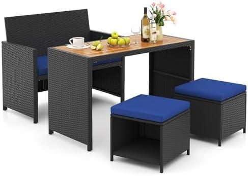 While this dining set offers numerous advantages, there are a few considerations to keep in mind. The weather-resistant materials help maintain its appearance, but routine cleaning is essential to prolong its life. Some users may find the seating height slightly lower, which could be less comfortable for taller individuals. this stylish and sturdy set is perfect for social dining and relaxation. For more details and purchasing options, check out the product here with the button below!