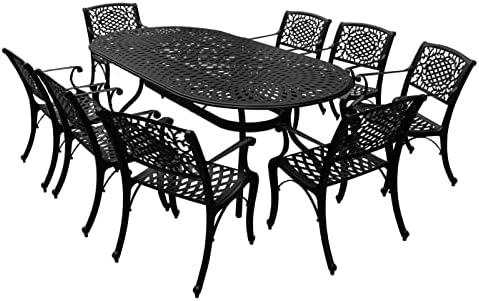 This elegant patio dining set features a large oval design, constructed from durable aluminum with a powder-coated, UV-resistant finish, ensuring longevity and resistance to weather elements. With the thoughtfully designed mesh lattice pattern, it presents a modern aesthetic that integrates seamlessly into any outdoor space, whether it be a patio, porch, deck, balcony, or backyard. Each of the eight arm chairs provides ample space, eliminating the need for cushions, making it an ideal choice for those looking for low-maintenance furniture. Additionally, the set is fitted with foot glides, preventing scratches and damage to your outdoor surfaces.