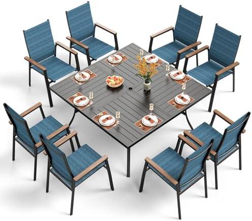 Designed to accommodate up to eight people, this patio dining set features a large square table made from high-quality metal with a rust-resistant finish, ensuring durability against the elements. The accompanying stackable aluminum chairs are lightweight and easy to move, perfect for both dining and entertaining. The breathable Textilene fabric used for the chair seats allows for comfort during those hot summer days, ensuring good ventilation. With an iron slat tabletop, this set offers a spacious dining experience, making it ideal for family gatherings or outdoor parties.