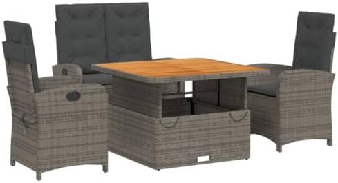 This outdoor seating arrangement is perfect for enjoying meals or unwinding outside. Crafted from durable PE rattan, it mimics the look of natural rattan while providing the strength and low-maintenance benefits of a synthetic material. The set includes two reclining chairs, one bench, and an adjustable table, allowing for versatile use on patios, in gardens, or backyards. The adjustable backrest and liftable tabletop cater to different settings, whether you’re hosting friends or simply enjoying a solo afternoon in the sun. The cushions are thickly padded for comfort and come with removable covers, making maintenance a breeze.