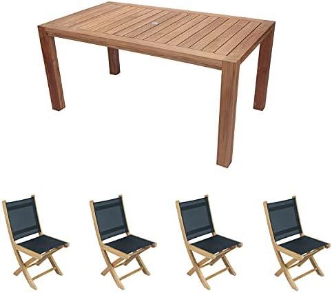 This outdoor dining set boasts a 63-inch rectangular table made from premium plantation-harvested teak wood, ensuring durability and a sophisticated look for your patio. The high oil content of the teak naturally protects the wood from various outdoor elements, making it perfect for long-lasting use. Crafted with precision through kiln-dried techniques and mortise and tenon joints, the table exudes incredible stability. The design also features a 2-inch umbrella hole, allowing you to add shade on sunny days. Coupled with four Sailmate folding chairs, this set provides comfort with its black sling seating while retaining the same exceptional quality as the table.