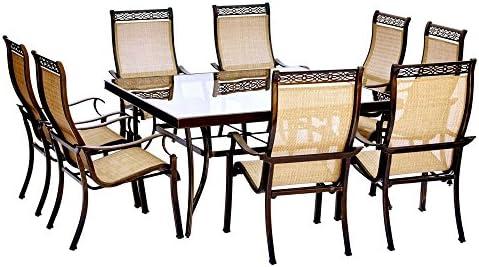 Transform your outdoor space with this exquisite dining set, featuring a spacious square table and eight comfortable chairs. The premium tempered glass tabletop not only enhances the elegance of your backyard but is also durable and easy to clean. Each chair is constructed with contoured PVC sling fabric, promoting comfort during long meals while the heavy-duty aluminum frames offer excellent resistance against rust and corrosion. Beautiful cast accents on the chair designs add a touch of sophistication, making this set a stunning centerpiece for gatherings with family and friends.
