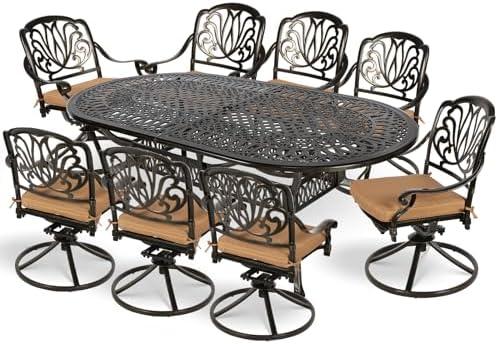 The patio dining set features a stunning oval table paired with eight cushioned swivel rocker chairs that enhance both comfort and style. Built with sturdy cast aluminum, this set promises durability while being resistant to rust, making it ideal for any weather conditions. The additional 2-inch umbrella hole in the center of the table provides a perfect spot for a patio umbrella, allowing you to enjoy shade during sunny days. The chairs are designed with ergonomic support and adjustable foot levelers, ensuring stability even on uneven surfaces.