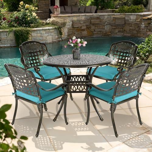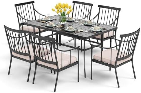 The set includes six cushioned iron chairs, crafted from high-density wrought iron that offers stronger support compared to regular steel chairs. Each chair comes with a plush 3.5-inch thick cushion, providing exceptional comfort. The weather-resistant materials used for the cushions ensure durability, while the easy assembly process makes it convenient for anyone to set up alone in about an hour. However, the weight capacity of 300 lbs per chair may be a consideration for some users.