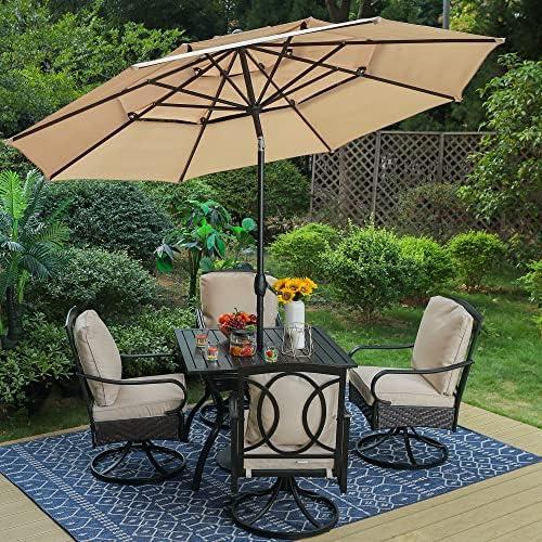 This outdoor dining set features four generously sized swivel chairs adorned with soft, padded cushions, offering the perfect blend of comfort and style for family gatherings or dinner parties. The durable E-coated metal frames ensure longevity while the 360-degree swivel function allows you to effortlessly engage with your guests. The accompanying 37″ square metal table is designed to accommodate up to four people, making it ideal for casual dining. With a dedicated umbrella hole, it offers the flexibility to insert a 10 ft umbrella for adequate shade on sunny days, ensuring you enjoy outdoor meals in comfort.