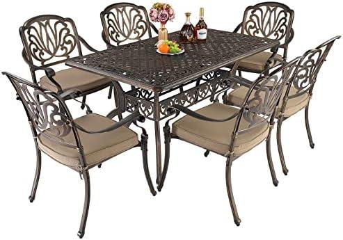 This outdoor dining collection is an excellent addition to any garden, yard, or patio space. Crafted from high-strength cast aluminum, it boasts remarkable weather resistance and durability, allowing for year-round use without the worries of rusting or corrosion. The unique carved designs not only add an artistic flair but also demonstrate superior craftsmanship, making it a visually appealing choice for outdoor dining. The large table measures 59 by 35.4 inches, providing ample space for family gatherings or entertaining friends without overwhelming your outdoor area. Each chair is equipped with comfortable cushions and can be easily stacked for efficient storage.