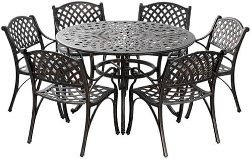 Experience outdoor dining like never before with this elegantly designed furniture set. Crafted from solid cast aluminum, it combines durability with a sophisticated look, featuring a stylish bronze finish that adds a touch of luxury to any patio, lawn, or deck. The ergonomic armrests and backrest of the chairs ensure maximum comfort, enabling you to relax while enjoying meals, conversations, or simply soaking up the sun. Additionally, the table comes with an umbrella hole, allowing for a sunshade on hot days, making it a practical and stylish addition to your outdoor space.