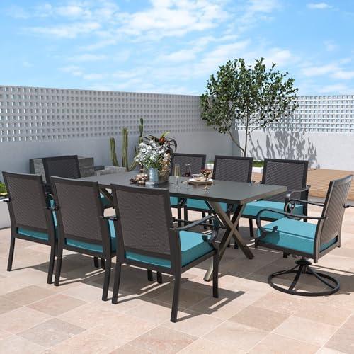 Gathering around this dining set creates a relaxed atmosphere for family and friends. The ensemble features six rattan chairs and two rattan rocking swivel chairs, paired with an oversized X-leg longboard table complete with a parasol hole. Crafted from high-quality, weather-resistant materials, the rattan weaving not only boasts an elegant look but also ensures long-lasting durability. The comfortable spill-resistant cushions enhance your dining experience, while the diverse chair combinations provide versatility for your dining needs. Installation is made easy with included instructions and tools, making it a hassle-free addition to your space.