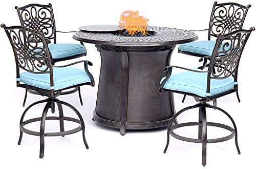 Elevate your outdoor gatherings with this captivating high-dining set, designed to foster a warm and inviting atmosphere for entertaining guests. Featuring four 360-degree swivel chairs with plush, quick-drying cushions, comfort is a top priority while you enjoy meals and conversations. The centerpiece is a stylish counter-height dining table that boasts a 19-inch fire pit, complete with gleaming fire glass to enhance the ambiance. The table is cleverly constructed with a hidden compartment to securely hold a 20 lb. gas tank and facilitate easy controls. Constructed with heavy-duty, rust-resistant aluminum and finished with a protective bronze coating, this set not only looks great but is built to withstand the elements.