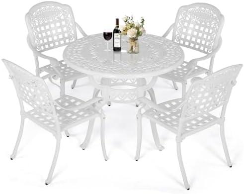 This stylish dining set is perfect for enhancing your outdoor spaces, featuring four stackable chairs and a round table equipped with a convenient umbrella hole. The elegant lattice-weave design and floral accents add a touch of sophistication to any patio, lawn, or balcony. With a rust-resistant and weather-resistant cast aluminum frame, it offers durability and ease of maintenance. The adjustable feet ensure stability on uneven surfaces, making it suitable for various outdoor conditions. The lightweight structure allows for effortless rearranging, while the stackable design facilitates convenient storage when not in use.