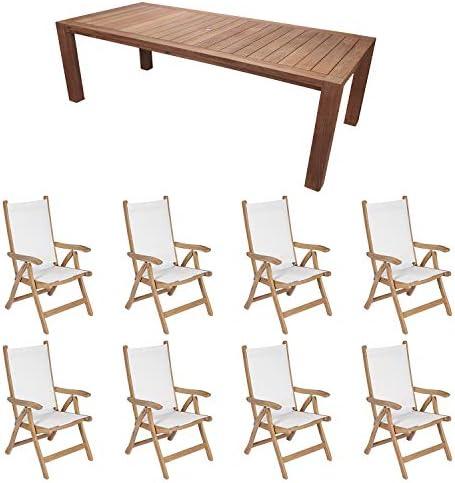 This exquisite outdoor furniture collection offers a blend of style and functionality, perfect for enhancing your patio space. Crafted from premium plantation-harvested teak, the set is designed to withstand the elements, with a high oil content that provides natural resistance to outdoor wear. The durable, kiln-dried wood features strong mortise and tenon joints, ensuring longevity. The expansive 96-inch rectangular table not only accommodates gatherings but also includes a 2-inch umbrella hole, making it versatile for any outdoor setting. Paired with eight reclining Florida chairs that provide five adjustable positions, this set guarantees comfort whether you’re dining or simply relaxing in the outdoors.