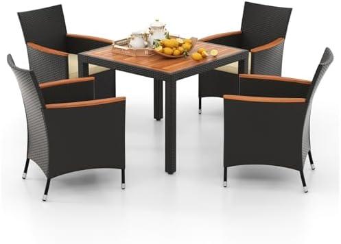 This stylish patio dining set is designed for comfort and durability. Constructed with a sturdy powder-coated steel frame and water-resistant PE rattan, it stands out as an ideal choice for outdoor dining or relaxation. The acacia hardwood tabletop is finished with natural oil, ensuring easy maintenance and an attractive surface for meals. The addition of thick cushions enhances comfort, making it a perfect spot for gatherings with friends and family.