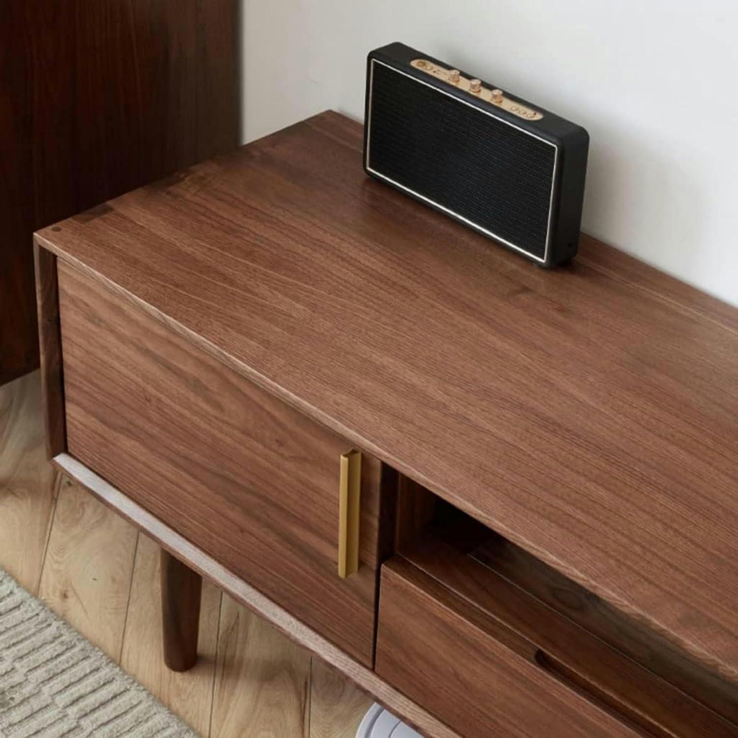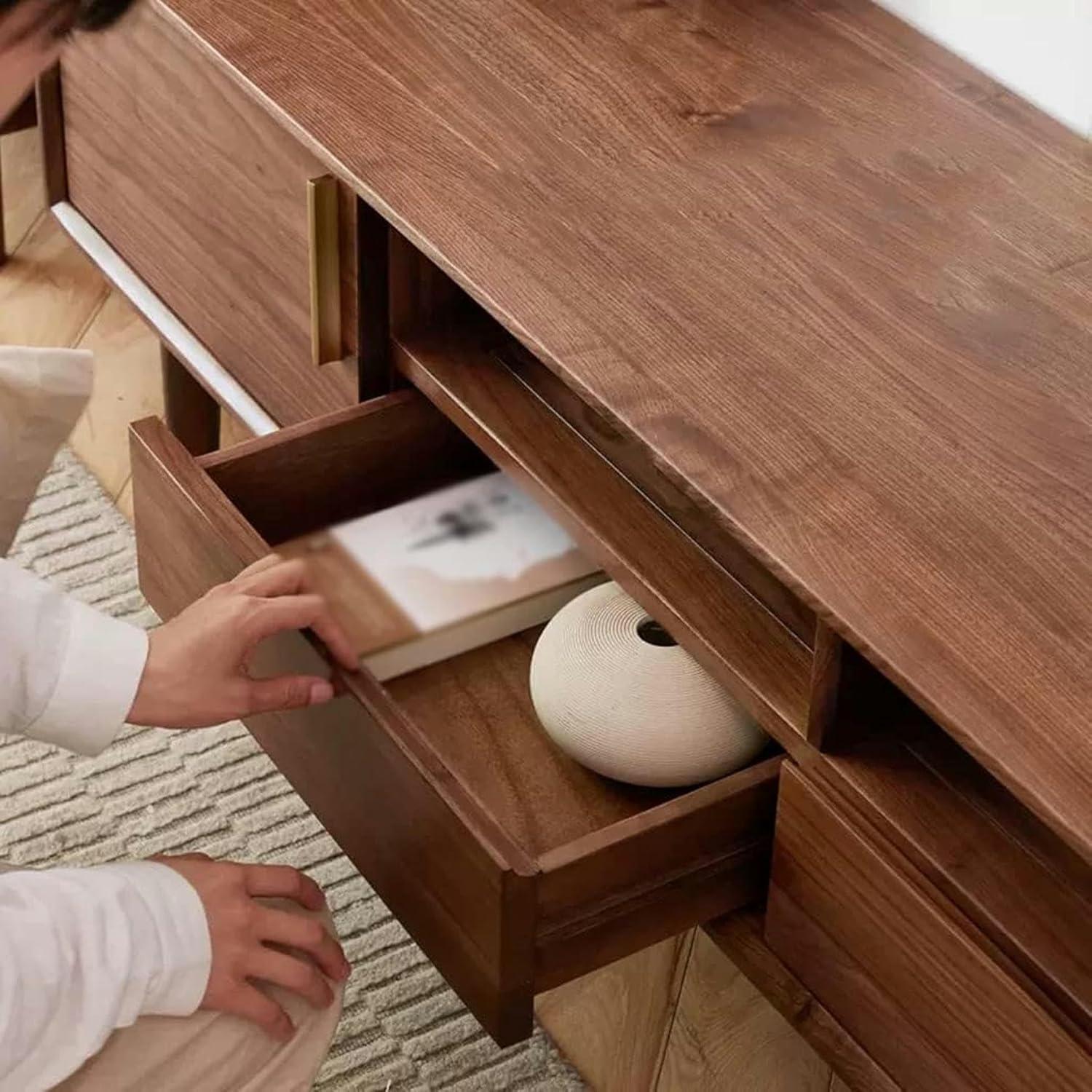 When you run a hand across the top and faces, the first things that register are the finish and how the veneer sits on the substrate. The surface typically shows a consistent stain and a low- to mid-sheen that softens reflections; finish sheen helps hide small dust and fingerprints but also slightly mutes the walnut grain. In close-up you’ll notice thin seam lines where veneer sheets meet at corners and along long edges, and those seams can be more visible under bright light. The texture alternates: some panels feel almost glassy where the lacquer is thicker,while other areas retain a faint “tooth” from the underlying wood pattern. Tiny milling or sanding marks can appear on routed edges and drawer fronts; they’re not always obvious until you change your viewing angle or brush your fingers along the edge. Small glue squeeze-out or touch-up fills may be present inside cabinet cavities or behind drawers — the kind of incidental traces that tend to show on manufactured pieces after assembly and handling.