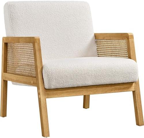 This accent chair combines luxurious comfort with a vintage aesthetic that makes it a stunning addition to any room, including a living room, bedroom, or makeup area. The generously padded seat measures 24” W x 20.3” D and is designed with high-density foam for ultimate support. Crafted from solid rubberwood, it boasts durability along with a maximum weight capacity of 309 lbs, making it suitable for a variety of users. Unique cane paneled armrests enhance its character, crafted from natural rattan webbing that adds a stylish touch to your decor.