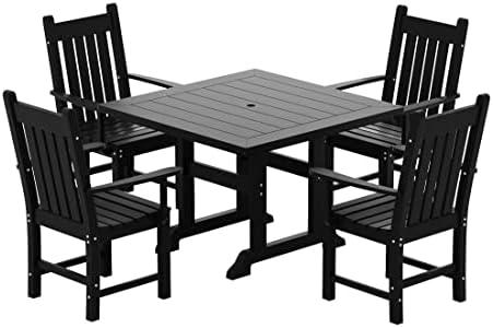 This 5-piece outdoor furniture collection transforms your patio into a cozy dining space for family and friends. Accommodating up to four guests comfortably, it features a 43″ square table designed to provide ample legroom. Crafted from HDPE material, it mimics the look of natural wood without any of the negatives like splintering or peeling, making it a durable choice for outdoor use. The semi-gloss finish and rustic slatted design not only enhance its aesthetic appeal but also allow rainwater to naturally drain away, ensuring it stays looking fresh and clean throughout the seasons.