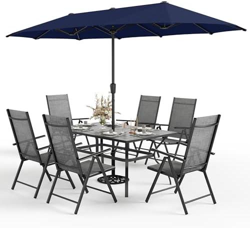 This outdoor dining set offers a blend of style and functionality, featuring a sturdy table designed to accommodate up to six guests comfortably. The black iron table measures 60.2″L x 37.8″W x 28″H and boasts rust-resistant properties, ensuring it remains a durable addition to your patio. The inclusion of a 13ft navy blue umbrella enhances outdoor dining experiences by providing instant shade. With a crank handle, the umbrella easily opens and closes within seconds, allowing quick setup or takedown as needed. The lightweight folding chairs accommodate individual preferences with a 7-position adjustable backrest, ensuring comfort while dining or relaxing.