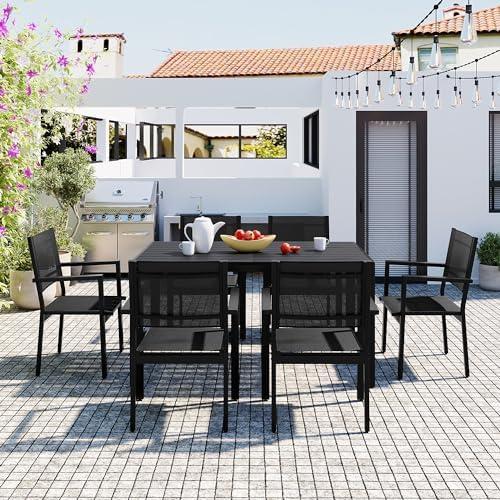 This outdoor dining ensemble is designed to elevate your patio experience with its heavy-duty, weather-resistant steel construction and breathable textile fabric chairs. Featuring an ergonomic backrest and an 18″ extra-wide chair design, comfort is ensured for diners of all sizes, supporting weights up to 396 lbs per chair. The table also boasts a solid weight capacity of 352.7 lbs, providing ample space for food and drinks during family gatherings. With chairs that are stackable, storage is efficient and convenient, making it an excellent choice for limited space.