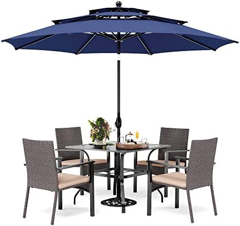 There are several notable advantages to this outdoor dining set. The weather-resistant materials and easy-to-clean surfaces make maintenance manageable, and the rugged construction ensures long-lasting use. Additionally, the 10ft patio umbrella offers ample shade and is designed with a convenient crank mechanism for easy operation. However, one downside to consider is that the umbrella base is not included, so it must be purchased separately. Also, users might find the assembly process slightly time-consuming, although all necessary parts are included in the package.