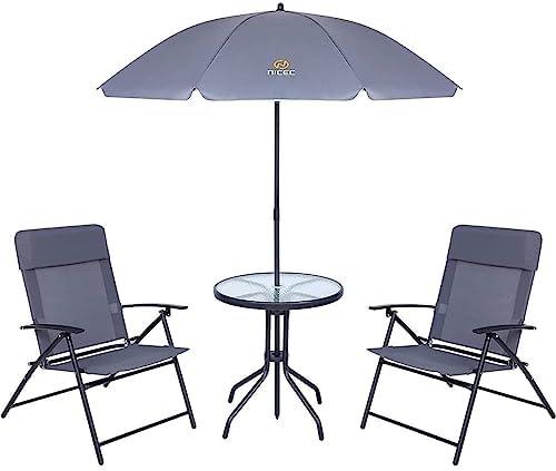 This elegant outdoor dining set features a sturdy table made of glass and metal, complemented by two folding chairs that make it easy to store or transport. With a tabletop size of 23.7 inches square and a height of 25.8 inches, it’s perfect for small patios or gardens while maintaining a chic appearance. The tilted removable umbrella provides shade, making it a comfortable choice for outdoor dining during sunny days. What stands out is the effortless assembly, providing immediate enjoyment without the worry of complex setup instructions.