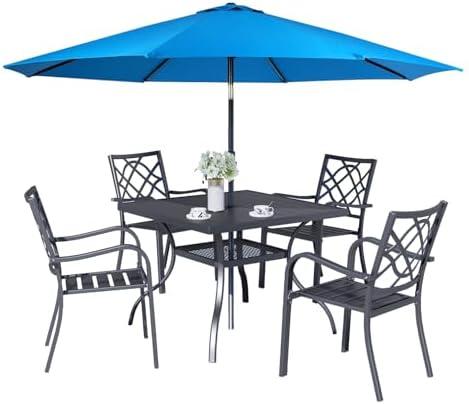 The featured outdoor dining solution combines style and functionality, featuring a square metal tabletop measuring 37” x 37”, along with four stackable bistro chairs. Designed with a durable black rust-proof powder-coated steel frame, this furniture is built to withstand harsh weather conditions while requiring minimal maintenance. The accompanying 10-foot sky blue umbrella not only provides generous shade but also includes a convenient crank-open system and a tilting feature for optimal sun protection throughout the day. The design also incorporates arched legs and protective non-slip feet to enhance stability and prevent floor scratches.
