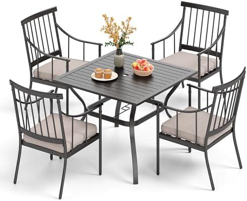 This outdoor dining collection features a 37” square metal table crafted from e-coated steel, ensuring it remains rust and weather-resistant for years to come. The stylish slatted tabletop adds a contemporary touch and is easy to integrate with various chair designs. With a standard-sized umbrella hole, it’s versatile for those sunny days, allowing for shaded outdoor dining or socializing. The set includes four cushioned steel chairs, designed with high-density wrought iron for durability and comfort, making it suitable for individuals of all sizes.