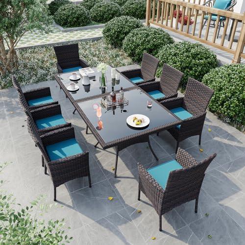 Transform your outdoor or indoor space into a chic dining area with this luxurious rattan dining set, featuring a sleek tempered glass tabletop accompanied by eight ergonomically designed chairs. Each chair is adorned with thick, removable cushions that boast zippered covers, ensuring comfort during long meals and easy cleaning. The set also includes a built-in umbrella cutout, allowing for shade during sunny days, making it perfect for a family gathering or a cozy dinner with friends. Constructed from durable, weather-resistant materials, this set is not only stylish but also designed to withstand the elements while maintaining its elegant appearance.