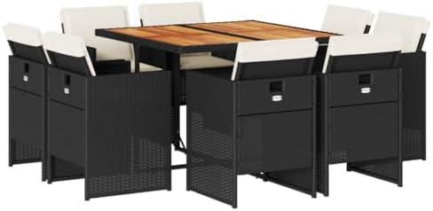 This nine-piece outdoor dining set presents an excellent option for enjoying meals in your garden, backyard, or patio. Crafted from durable PE rattan, which mimics natural rattan, it combines aesthetic appeal with long-lasting performance. The material is lightweight and low-maintenance, making it easy to clean and resilient to weather conditions. The set includes a sturdy table with a solid acacia wood top, ensuring a stable surface for dining experiences. The thick, padded cushions provide comfort, and their removable covers make maintenance a breeze, allowing for easy washing whenever needed.