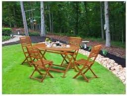 This charming patio set features a robust rectangular dining table accompanied by four versatile folding chairs. Constructed from high-quality Acacia wood, this furniture is designed to withstand the elements while adding an elegant touch to any outdoor space. With its unique design and comfortable seating capacity of up to four, you can enjoy memorable meals or leisurely afternoons with friends and family. The wood’s natural oil finish not only enhances durability but also provides resistance to water, making maintenance a breeze with just a damp towel.