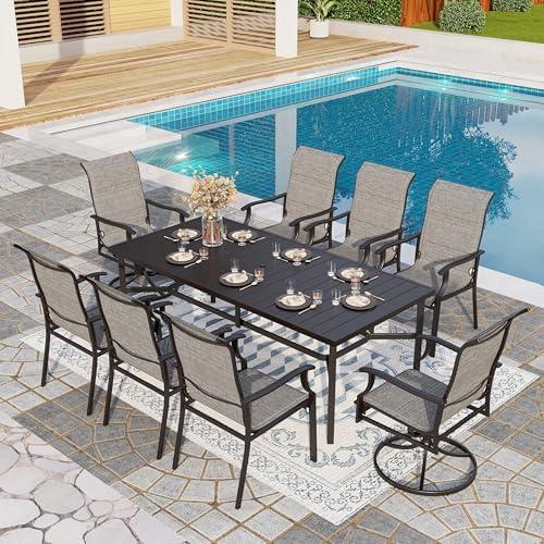 This elegant outdoor dining set accommodates up to eight people, making it perfect for family gatherings or al fresco dining with friends. Featuring two swivel chairs and six fixed chairs, the high back design ensures comfort, while the sturdy metal frame with E-coating technology protects against rust and weather damage. The set includes a spacious rectangular table with a 1.7-inch umbrella hole, providing versatility for outdoor use. The quick-drying fabric of the chairs enhances practicality by allowing for easy cleaning and maintenance, increasing the overall usability of the set.