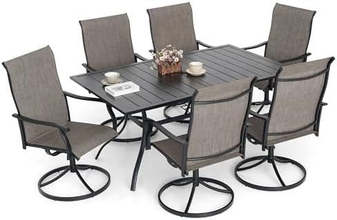 Designed for both aesthetics and comfort, this outdoor dining set features six swivel rocking chairs and a spacious rectangular dining table, making it ideal for hosting gatherings on your patio, deck, or poolside. With ergonomic designs, each chair boasts a 360° swivel function and a gentle rocking motion, enhancing the dining experience. The unique striped textile fabric not only offers enhanced comfort but is also air and water permeable, making it suitable for various seasons. With sturdiness in mind, the chairs support up to 300 pounds and have wide armrests, making this set a great option for anyone looking for durable and stylish outdoor furniture.