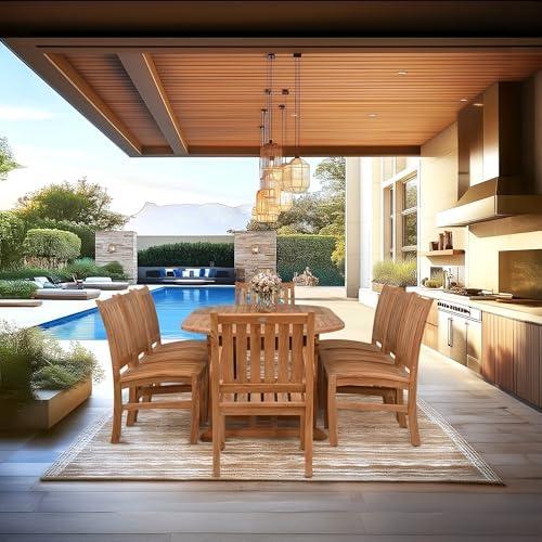 Pros of this dining set include its weather resistance and UV protection, ensuring your furniture stays in top condition despite sun exposure. It’s also incredibly sturdy, making it ideal for frequent use. On the downside, some may find the assembly process a bit challenging due to the number of pieces involved. Additionally, while teak naturally resists rot, it does require periodic maintenance to maintain its original color and sheen.