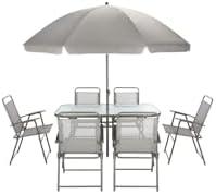 This contemporary dining set elevates outdoor aesthetics with its chic design, including a glass-topped bistro table, six grey foldaway chairs, and a coordinating umbrella. Crafted from sturdy steel with textline seating, it merges comfort and durability for seamless outdoor living. The dimensions of the chairs are 20.87″ wide, 23.62″ deep, and 35.43″ high, while the table measures 55.12″ wide, 31.5″ deep, and 28.35″ high, making it a perfect fit for various outdoor spaces. Assembly is straightforward with included hardware and step-by-step instructions, ensuring a hassle-free setup.