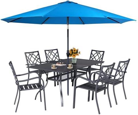 This outdoor dining set combines comfort and practicality seamlessly. With six stackable chairs made of durable metal and a rectangular dining table featuring an umbrella hole, it is ideal for family gatherings and outdoor meals. The sky blue umbrella, crafted from durable polyester, offers up to 99% UV protection, ensuring you stay cool and shaded while enjoying al fresco dining. The well-designed dimensions of the chairs (25″D x 20″W x 35″H) and table (60″L x 37″W x 28″H) make it suitable for various outdoor spaces like courtyards, patios, gardens, and balconies. Assembly is simple and straightforward, thanks to the included hardware and clear instructions.