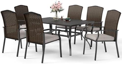 The combination of wicker chairs and a sturdy rectangular metal table provides a contemporary aesthetic that enhances any backyard or lawn. This dining set accommodates up to six people comfortably, making it perfect for family gatherings or entertaining friends. The included cushions add an extra layer of comfort, offering an inviting space for long meals or evening chats. The versatility of the table, featuring an umbrella hole, allows you to add shade on sunny days, ensuring a pleasant dining experience regardless of the weather.