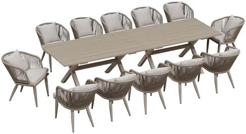 This impressive set is designed with contemporary aesthetics in mind, incorporating a rectangular extendable table and ten solid wood chairs made from 100% FSC certified eucalyptus. The versatility of the table allows you to easily extend its length from 70″ to 118″ by adding leaves, accommodating larger gatherings. With a weight capacity of up to 250 lbs per chair, it ensures durability without compromising comfort. The furniture can withstand various weather conditions, making it ideal for outdoor use, although periodic maintenance with sealer oil is recommended to protect its finish.