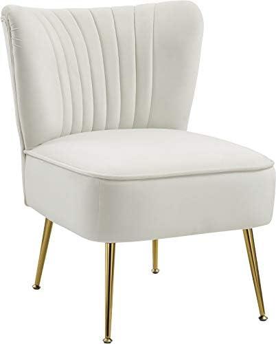 This accent chair features a soft cream velvet upholstery that not only enhances comfort but also elevates the aesthetic appeal of any space. The deep channel tufting along the back offers both style and support, making it a perfect conversation starter. Designed with custom gold steel legs, it seamlessly blends into contemporary decor, providing a sophisticated touch to your living area or office. The dimensions of 22.5″ W x 26.5″ D x 29.5″ H make it a versatile option that can fit snugly in compact spaces while still making a bold statement.
