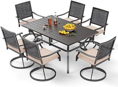 This outdoor dining ensemble features swivel chairs designed to enhance your dining experience with both comfort and durability. The solid steel frame provides excellent support while resisting the elements, making it a reliable choice for outdoor use. The beautiful cushioned seats add an extra layer of comfort, allowing you to enjoy leisurely meals and social interactions with family and friends. The rectangular dining table is not only spacious enough to accommodate six people but also includes a convenient umbrella hole, perfect for enjoying meals in the shade on sunny days. The modern slatted design complements any outdoor space, whether it be a garden or patio.