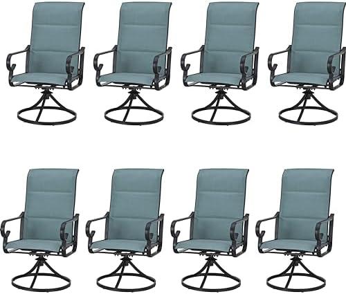 The outdoor seating arrangement features eight elegantly designed chairs that perfectly blend comfort and style, making it suitable for any patio, backyard, or garden gathering. Each chair is equipped with a 360-degree swivel function, providing convenience as you can easily turn to reach for items or converse with others without the need to shift your entire body. The high backrest and cushioned Textilene fabric ensure breathable seating while adapting to various weather conditions. Additionally, the sturdy steel frame supports up to 300 pounds, establishing both stability and durability for long-term use.
