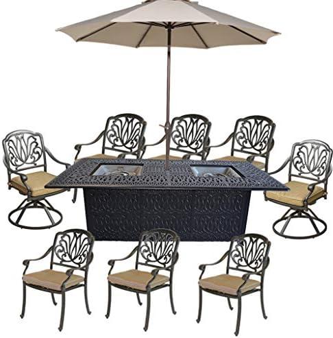 This dining set features a substantial double burner table measuring 44″ x 84″, paired elegantly with six standard dining chairs and two patio swivel rockers. The inclusion of cushions adds an extra layer of comfort, perfect for extended meals or gatherings. The cast aluminum frame ensures durability and is designed for low maintenance, making it a practical choice for both indoor and outdoor settings. With a 100% rustproof guarantee, it stands as a reliable option for casual dining experiences.