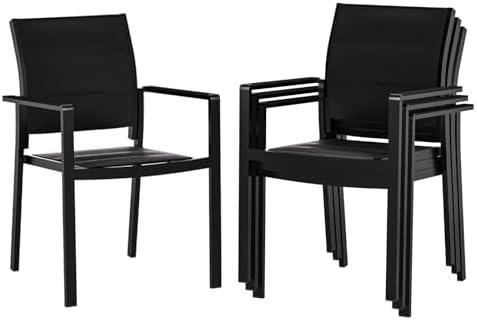 These outdoor dining chairs are designed for both comfort and functionality. The upgraded padded textilene fabric ensures excellent breathability, allowing you to sit for hours without feeling uncomfortable. The chairs feature a curved design for the backrest and seat, providing a relaxed sitting posture. Additionally, the armrests come with rounded edges, minimizing the risk of accidents. With a sturdy aluminum frame finished in sleek black powder coating, these chairs resist rust and are built to withstand various outdoor conditions. The non-slip foot pads enhance stability and protect your floors, making them a practical addition to any balcony, porch, garden, or poolside area.