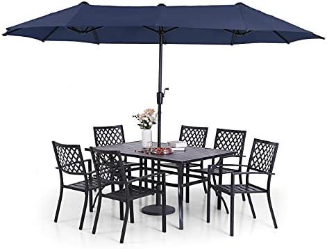 Enjoy outdoor meals with this 8-piece metal furniture set designed for durability and comfort. The sturdy wrought iron frame, complemented by premium e-coating, offers rust and weather resistance, ensuring longevity for years of outdoor enjoyment. The impressive 13ft double-sided umbrella provides generous shade, keeping you comfortable in your backyard, patio, or poolside. The umbrella features a simple crank mechanism for easy opening and closing, making it convenient for everyday use. With dimensions of 60″ L x 38″ W x 28″ H for the table and stackable chairs that can support up to 300 lbs, it’s perfect for family gatherings.