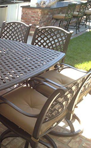 The elegantly designed set features a spacious square dining table measuring 64″ x 64″ with a height of 29″. Constructed from solid cast aluminum, it boasts a powder-coated finish that enhances durability, ensuring it is rust-free and built to last. Eight swivel rocker dining chairs come with plush Sunbrella sesame-colored cushions, providing both comfort and style. The cushioned seats are tailored for relaxation, making it perfect for long dinner conversations or outdoor gatherings. Assembly is required, but the result is well worth the effort, presenting an elegant outdoor dining experience.