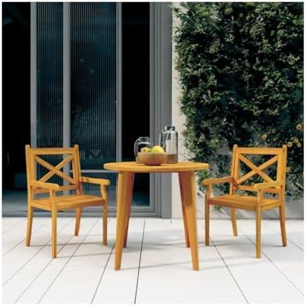This patio dining set, crafted from solid Acacia wood with an elegant oil finish, brings rustic charm to any outdoor space. The slatted design not only adds an aesthetic appeal but also ensures durability and comfort. With a sturdy tabletop sizing 33.5″ in diameter, it’s perfect for holding snacks, drinks, or decorative items during your gatherings. The armrest height is conveniently set at 23.2″ from the ground, providing optimal comfort for all users, complemented by chairs that measure 21.3″ x 21.7″ x 35.4″. Whether you’re enjoying a meal with family or entertaining friends, this set makes for an inviting dining experience.