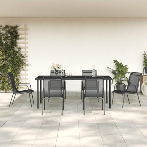 This outdoor dining ensemble showcases an elegant design, destined to become the centerpiece of your patio or garden. Comprising a sturdy table and six chairs, it is built with a powder-coated steel frame that ensures stability and durability. The uniquely designed chairs feature a weather-resistant textilene fabric that not only withstands the elements but is also easy to clean. Offering a comfortable seating experience, the chairs come with a curved backrest and armrests that enhance ergonomics, making those long meals or afternoon chats all the more enjoyable. The tabletop, made of tempered glass, provides a sophisticated surface that is perfect for snacks, drinks, or decorative items.