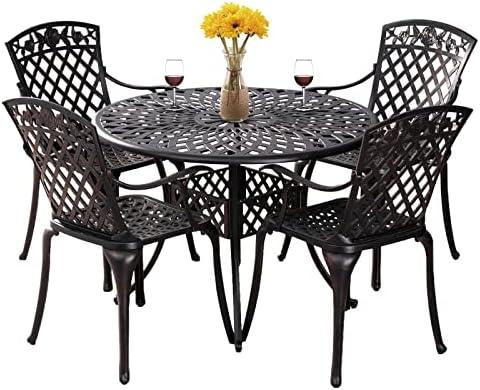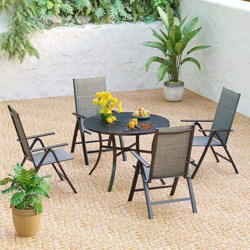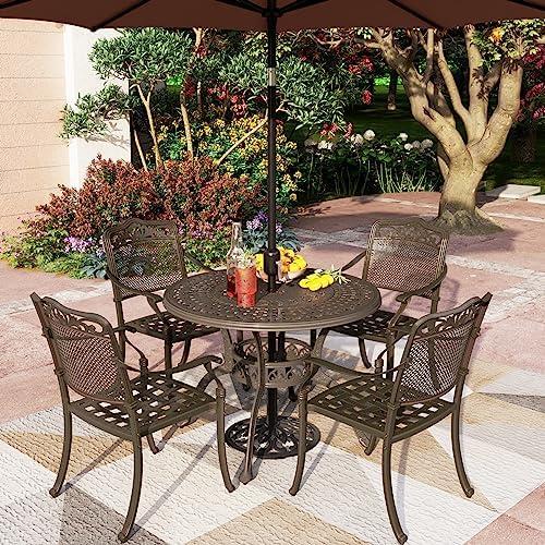 This dining set combines style and functionality with its sturdy cast aluminum construction and ergonomic design. The 42″ round table is perfect for intimate gatherings, while the four high-back arm chairs provide exceptional comfort with their slightly tilted backrests and curved armrests. With adjustable foot pads, this set maintains stability on uneven surfaces. The inclusion of a 1.97″ umbrella hole allows you to add a shade umbrella for those sunny days, enhancing your outdoor experience. Its high-performance powder coating ensures long-lasting protection against rust, scratches, and rain.