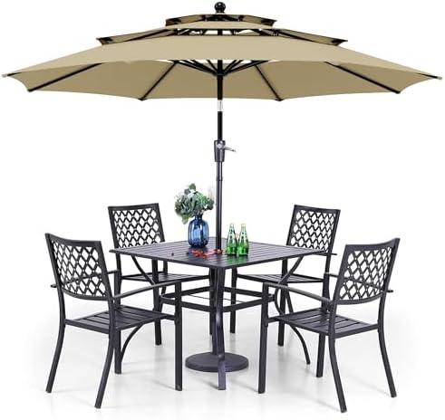 This beautifully designed outdoor dining ensemble features a robust square dining table and four comfortable bistro chairs, perfect for gatherings in your garden or on the patio. The metal steel frame of the table is designed to withstand various weather conditions, offering rust and weather resistance, ensuring that maintenance is minimal. With a convenient size of 37″x37″, it includes a pre-cut umbrella hole that accommodates most patio umbrellas without wobbling. The chairs provide a generous seat height of 17 inches and can support a weight capacity of up to 300 lbs. This set not only enhances your outdoor space but also provides comfort and durability for family gatherings, evening dinners, or casual luncheons.