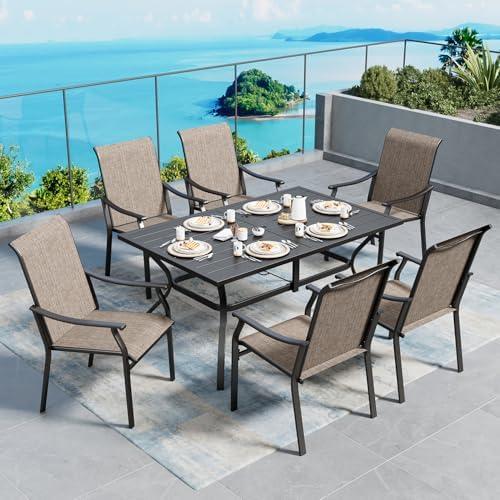 This outdoor dining combination includes a spacious rectangular table and six supportive chairs, designed to enhance your patio or garden experience. Each chair is crafted with breathable Textilene fabric that ensures comfort while resisting fading, oil, and water damage, making them suitable for all seasons. The heavy-duty metal frame, backed by advanced E-COATING and POWDER-COATING techniques, guarantees durability against rust and weather conditions. With a table dimension of 60″ W x 38″ D x 28″ H, and a convenient umbrella hole, this set is perfect for family gatherings or intimate dining experiences outside.