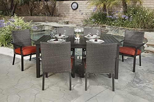 This exceptional dining set combines durability and style, featuring a butterfly extension table that expands to an impressive 91 inches, providing ample space for gatherings. Enhanced with a stunning slatted top, the table integrates an umbrella hole, allowing you to enjoy your meals in various weather conditions. The six hand-woven aluminum dining chairs come in a striking Chili Red shade and are crafted from breathable, weather-resistant Olefin material, ensuring comfort and longevity. Each chair supports up to 250 lbs and is accompanied by a generous 6-inch cushion, making them perfect for long dining sessions outside.
