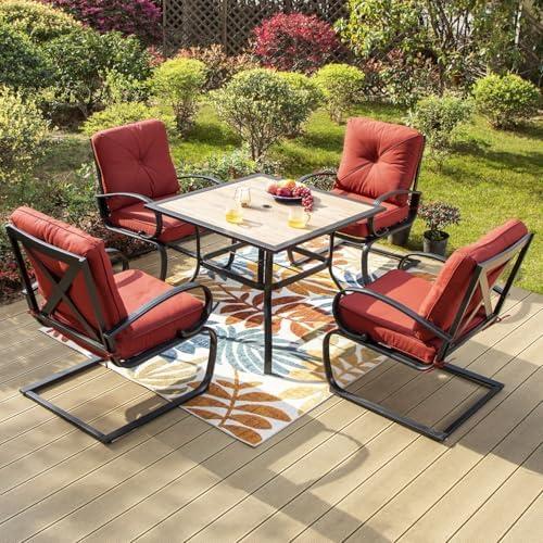 This dining set features four metal spring motion chairs and a square table designed for both indoor and outdoor use. Constructed from high-quality steel with a rust-resistant coating, it ensures durability while maintaining a sleek aesthetic. The set’s modern X shape design enhances comfort, making it suitable for casual meals or entertaining guests by the poolside or on the deck. The table includes a 1.57-inch umbrella hole, allowing easy installation of shading solutions during sunny days. Additionally, the thick, wood-like tabletop is simple to maintain, requiring just a damp cloth for cleaning.